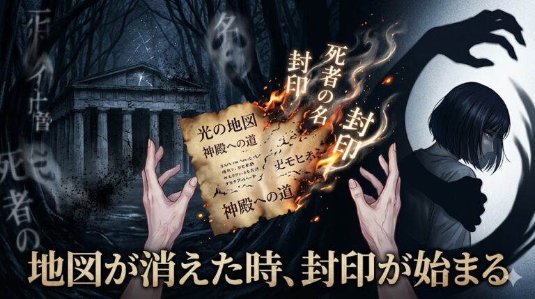 第4話:封印された地図、聖域へ —— 地図が手に取られると、文字が光りながら消え、同時に遠くに語られる死者たちの名前が耳元で響き、人間の狂気と説明不能な接触を生む。不可解な出来事として、世界はその影に閉じ込められることになる。